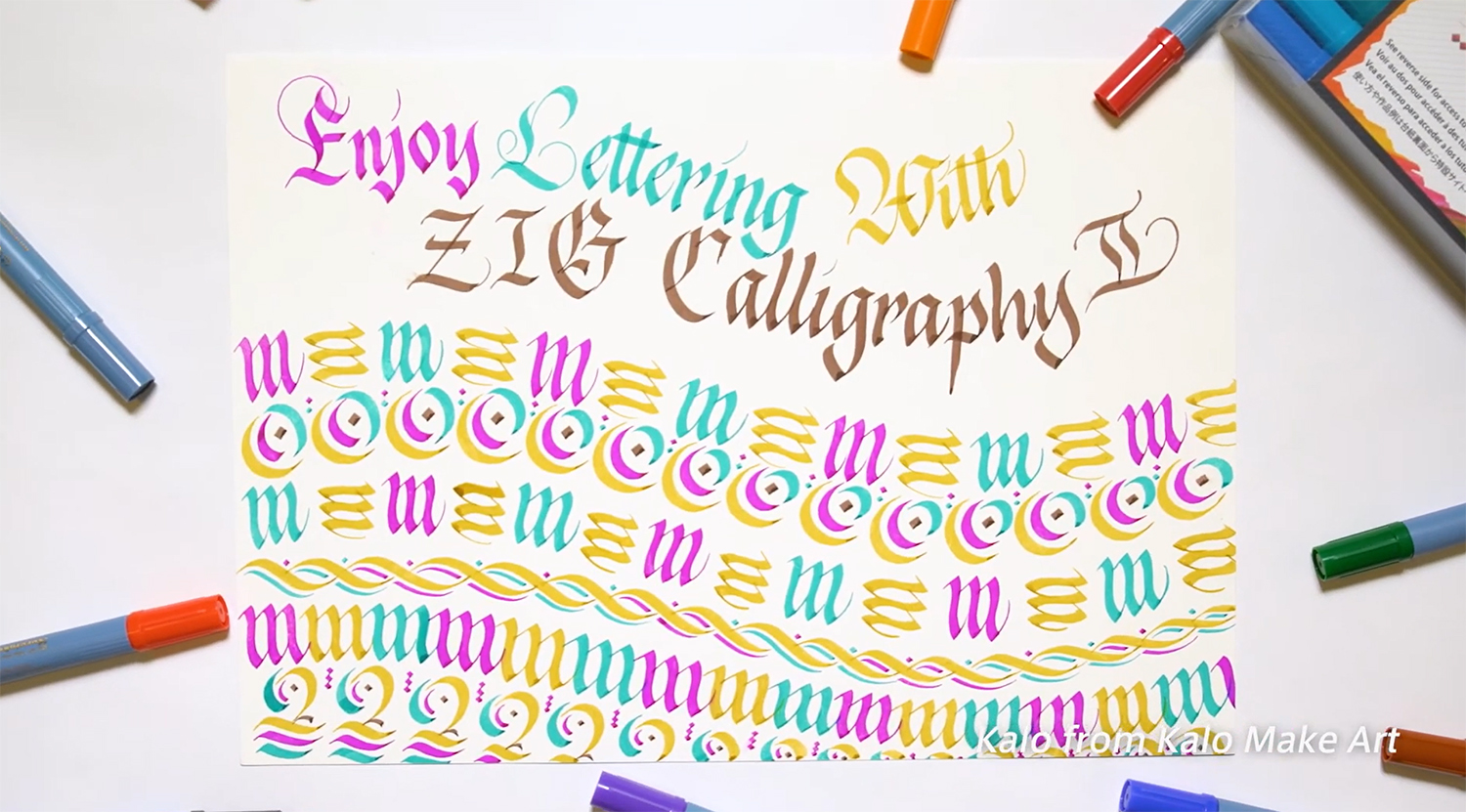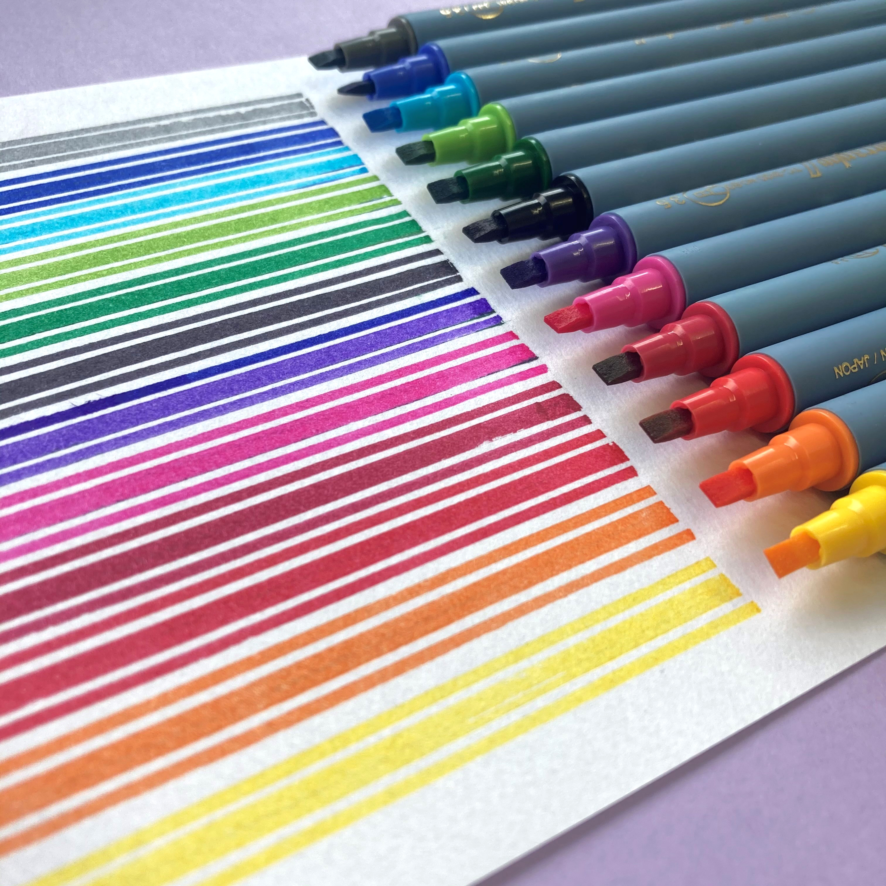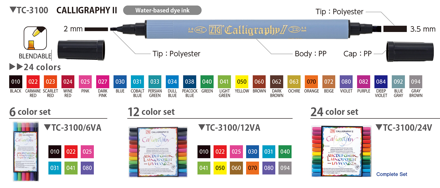 Kuretake Zig Calligraphy II TC-3100 to pisaki z barwnikowym tuszem na bazie wody. Stworzone do kaligrafii - krojów takich jak italika, gotyk, bastarda włoska, uncjała. Każdy pisak z tej serii ma dwie płasko ścięte końcówki: 2mm oraz 3,5mm. W porównaniu z tradycyjnymi stalówkami czy piórami wiecznymi gwarantują dużo większy komfort i czystość pracy. Można je stosować jako uzupełnienie podczas pracy markerami na bazie alkoholu bez obawy rozmycia. Tusz pięknie miesza się z wodą, jest bezzapachowy i nie zawiera ksylenu.