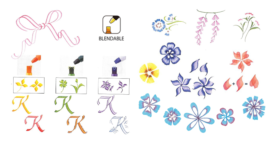 Tusz markerów kaligraficznych można przepięknie blendować na końcówkach dla spektakularnych efektów. Wystarczy przytrzymać przy końcówce pisak innego koloru - widać jak tusz z wyżej trzymanego pisaka przechodzi na drugi marker.