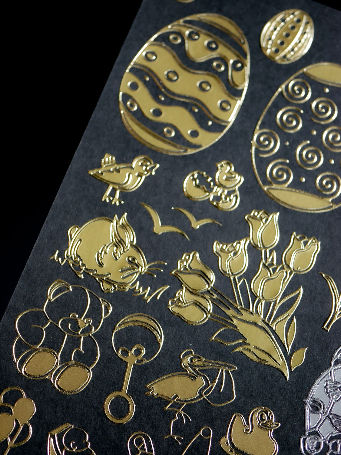 Arkusz naklejki Peel Off ma rozmiar 10 x 23 cm, występują w kolorze złotym lub srebrnym.