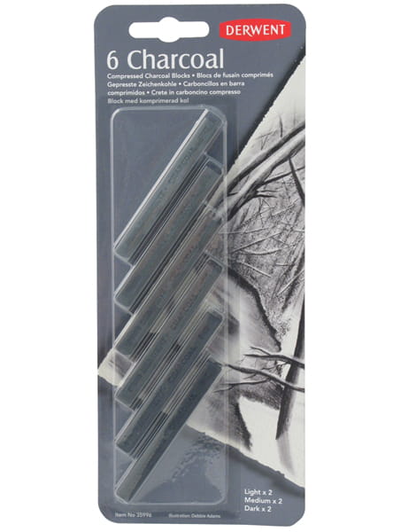 Prasowany węgiel Derwent Compresed Charcoal jest grubym kawałkiem czystego przemielonego i sprasowanego węgla drzewnego. Można nim tworzyć głębokie, intensywne odcienie czerni zupełnie inne od grafitowych. Tym sprasowanym węglowym sztyftem można rysować krawędzią (wtedy linia jest węższa) lub całą jego szerokością podczas rysowania tła bądź zarysowywania dużego fragmentu pracy. Występuje w trzech uniwersalnych miękkościach: miękki(soft), średni(medium) i twardy (hard). Dla osób, które lubią pracować w porządku polecamy uniwersalny uchwyt do sztyftów firmy Derwent – Gripper’s, dzięki niemu ręce będą czyste i można uniknąć niechciany zabrudzeń na pracy. Zestaw zaiwera po dwie sztuki węgla z kazdej miękkości.