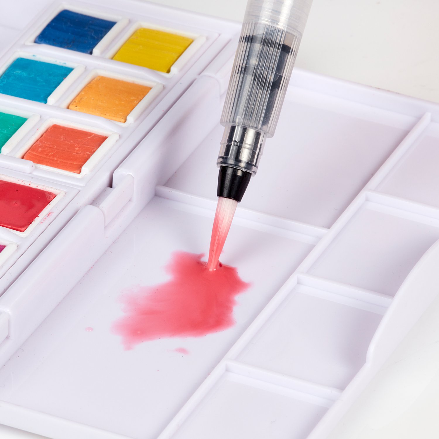 Zestaw zawiera 12 półkostek oraz mini pędzel wodny, zamknięte w kompaktowej kasetce z paletką do mieszania kolorów – idealnej do malowania w plenerze i w podróży.