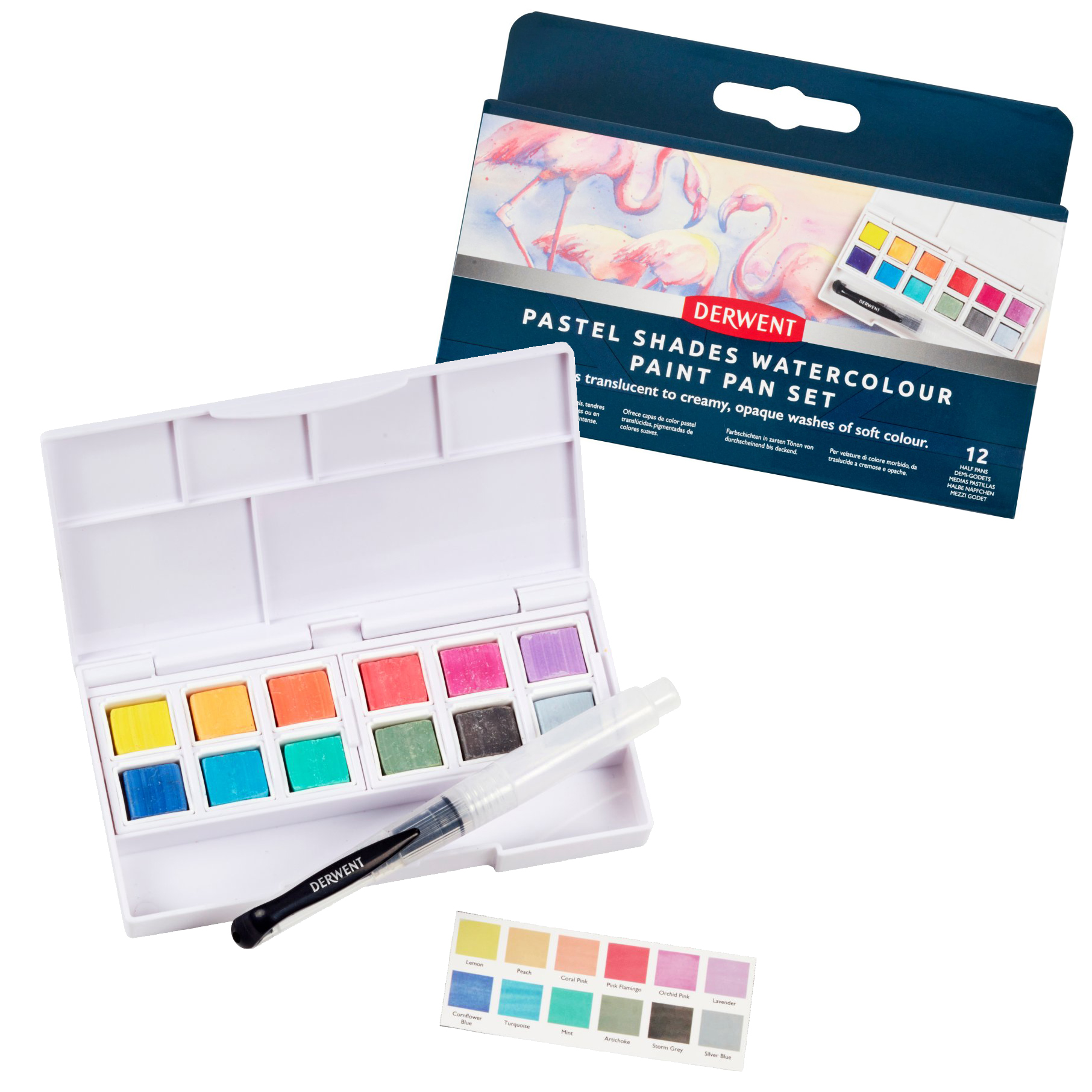 Kompaktowy zestaw Derwent Pastel Shades zawiera 12 kolorów pastelowej farby Derwent o unikalnej formule, pędzelek na wodę, gąbeczkę do czyszczenia pędzelka. Na wieczku kasetki znajduje się aż 5 obszarów do mieszania odcieni.