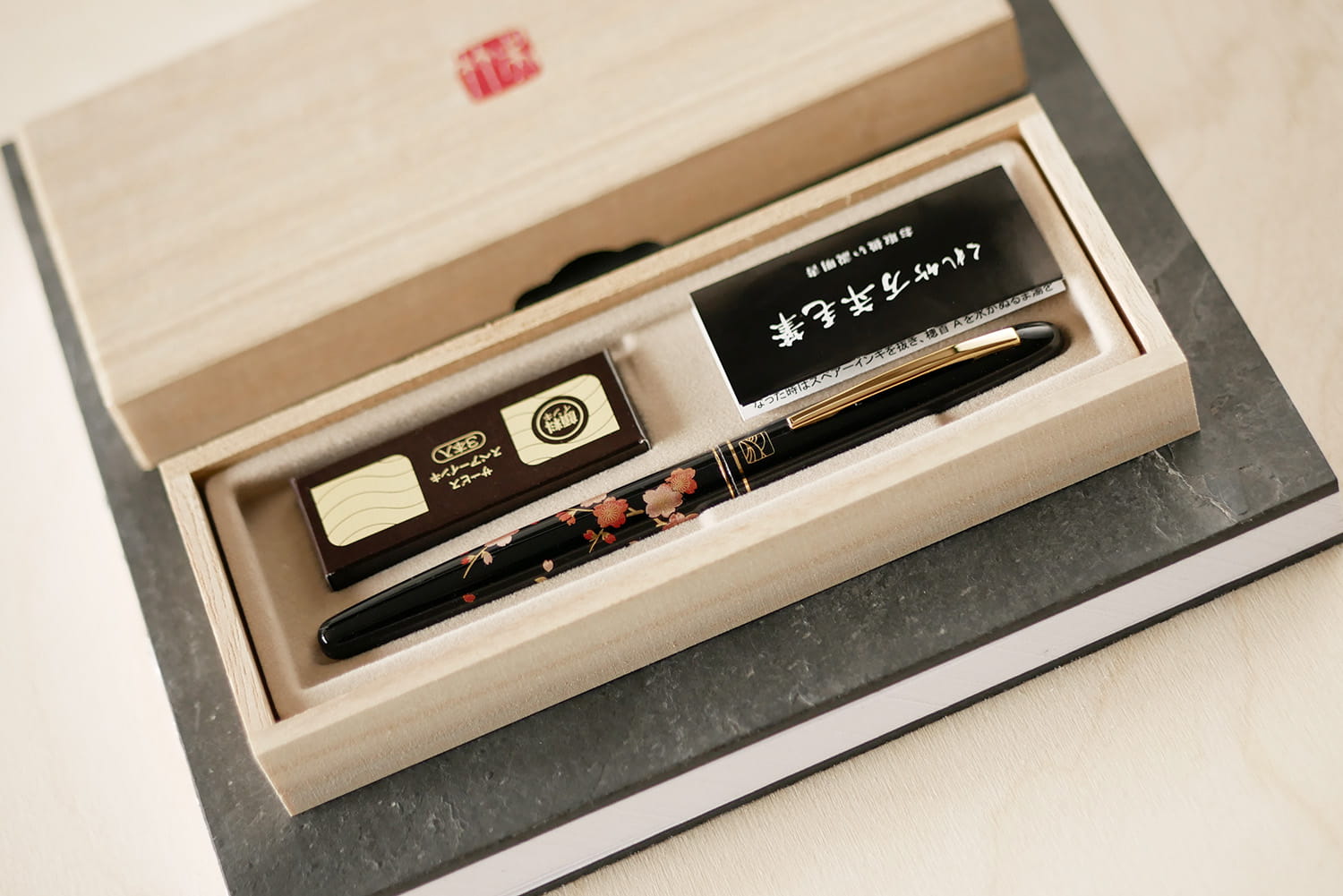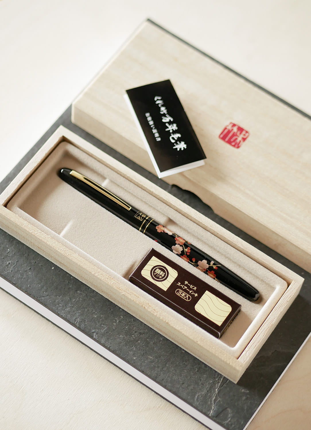 Elegancki, bardzo starannie wykonany i pięknie zdobiony (motyw kwitnącej wiśni) pisak pędzelkowy w formie pióra. Zawiera wodny, pigmentowy tusz w kolorze czarnym. Znakomity do kaligrafii japońskiej, posiada końcówkę z wytrzymałego poliestrowego włosia. Użytkowanie tego wyjątkowego pisaka to prawdziwa przyjemność. Zestaw w stylowym, drewnianym pudełku zawiera pióro oraz 3 wymienne wkłady z tuszem.