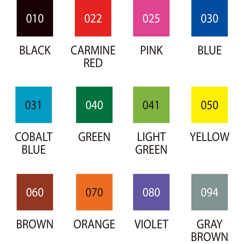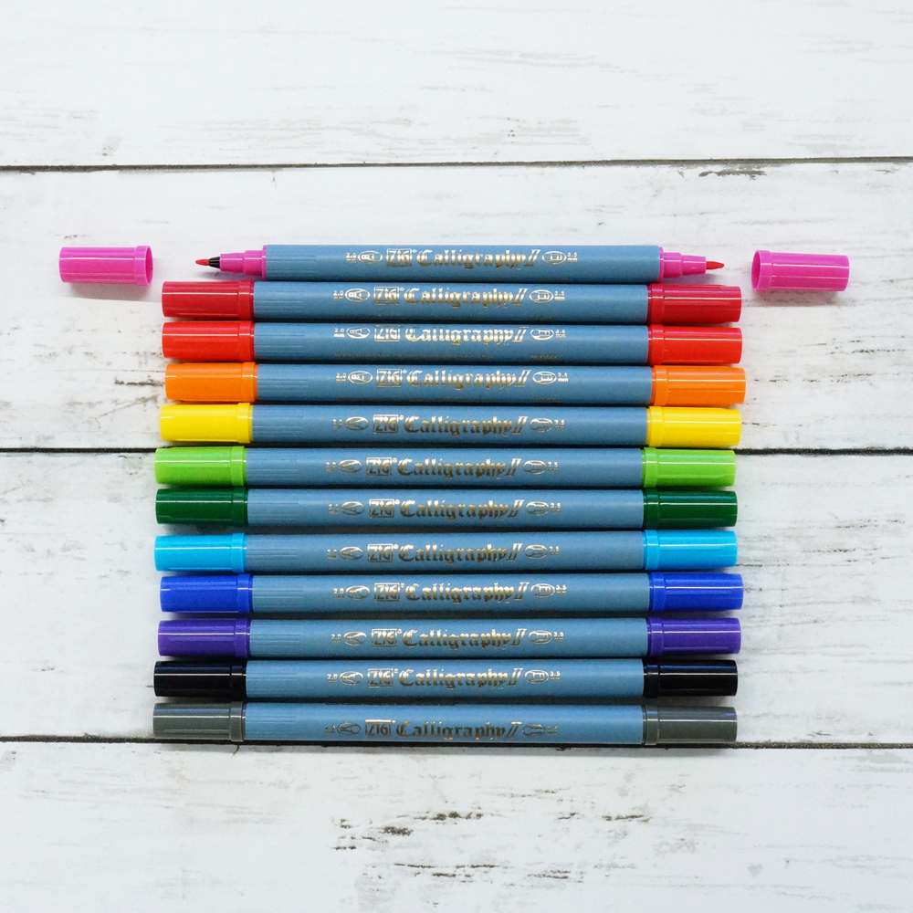 Zestaw dwunastu pisaków / markerów kaligraficznych Kuretake ZIG Calligraphy II 2mm & 3,5mm (każdy marker w zestawie ma dwie ścięte końcówki). Kolory: 010 Black, 022 Carmine Red, 025 Pink, 030 Blue, 031 Cobalt Blue, 040 Green, 041 Light Green, 050 Yellow, 060 Brown, 070 Orange, 080 Violet, 094 Gray Brown.