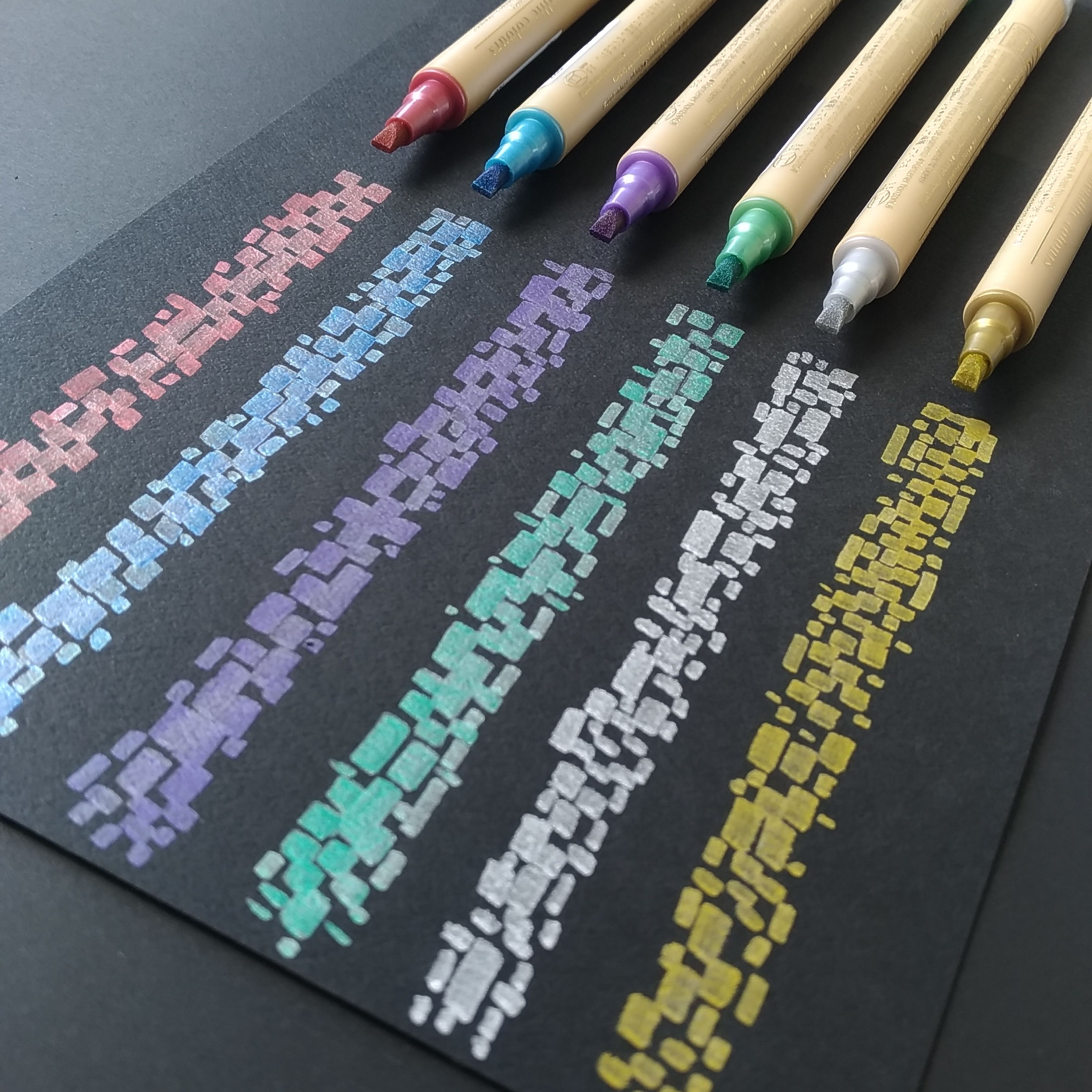 Markery metaliczne ZIG Memory System Calligraphy Metallic do kaligrafii sprawdzą się nie tylko do pisania ale i ozdabiana w projektach rękodzielniczych /scrapbookingowych. Szczególnie pięknie wyglądają na ciemnych powierzchniach! Każdy pisak z tej serii ma dwie końcówki ścięte na płasko, w szerokościach 2mm oraz 3,5mm.