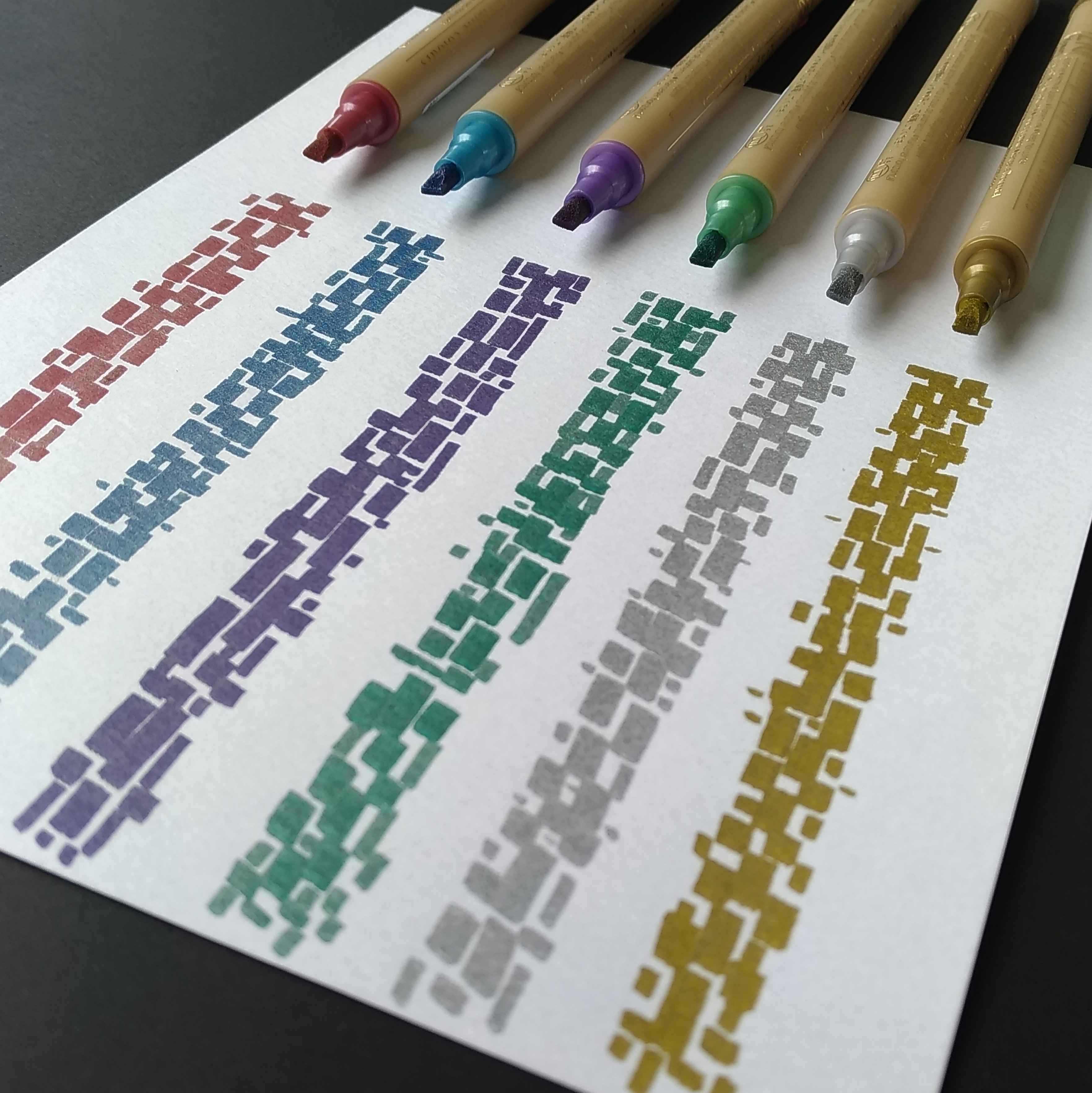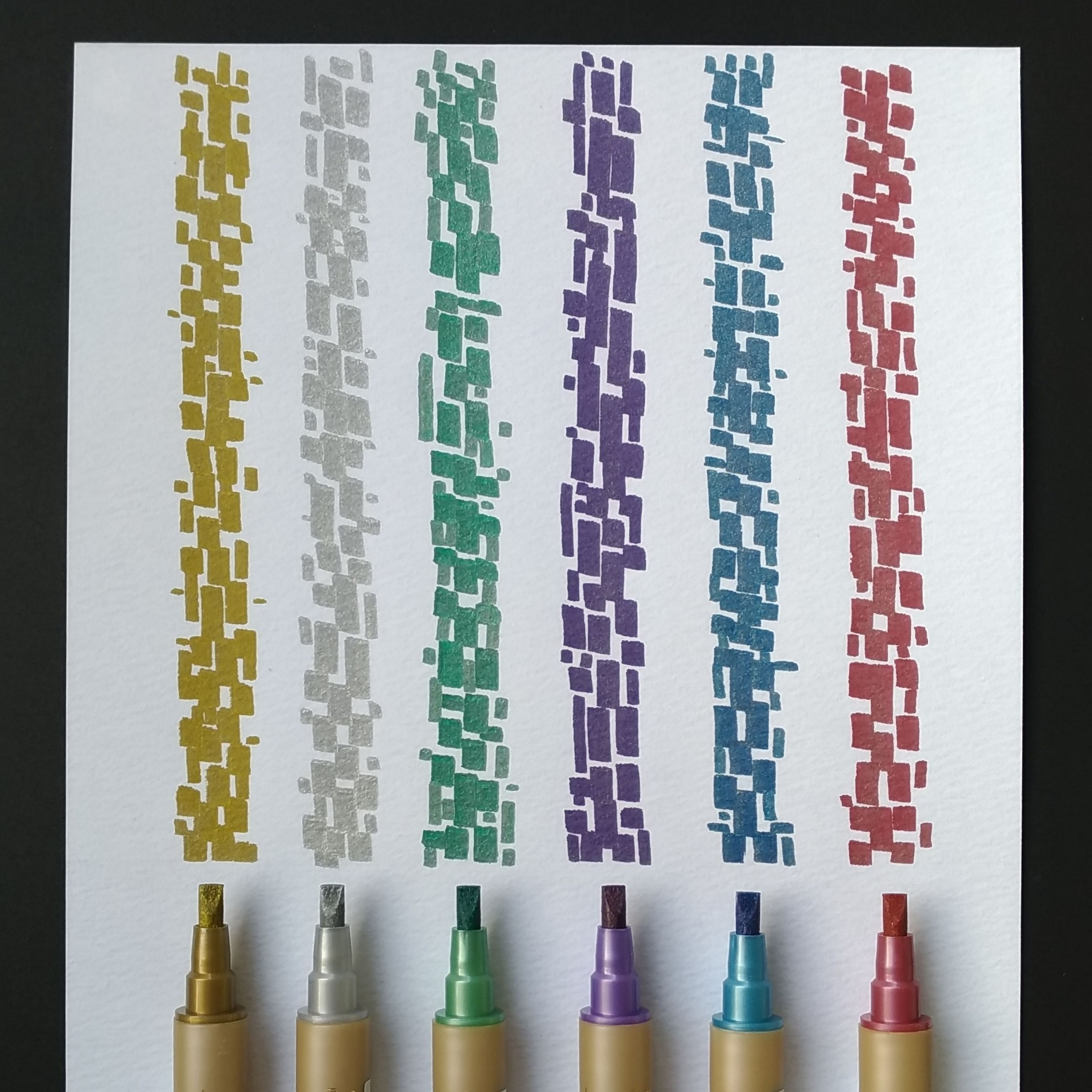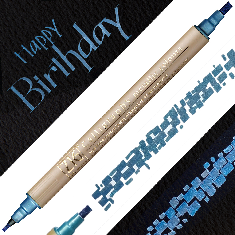 Markery metaliczne ZIG Memory System Calligraphy Metallic do kaligrafii sprawdzą się nie tylko do pisania ale i ozdabiana w projektach rękodzielniczych /scrapbookingowych. Szczególnie pięknie wyglądają na ciemnych powierzchniach! Każdy pisak z tej serii ma dwie końcówki ścięte na płasko, w szerokościach 2mm oraz 3,5mm.