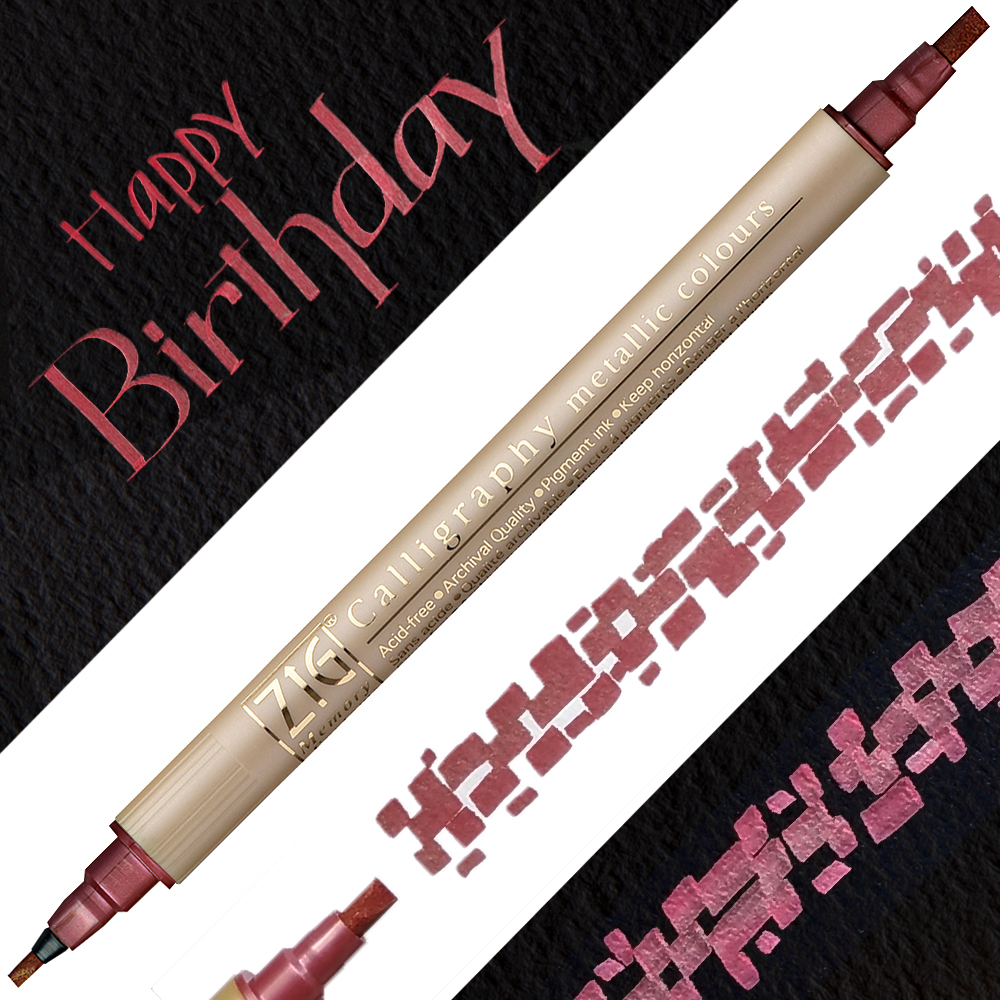 Markery metaliczne ZIG Memory System Calligraphy Metallic do kaligrafii sprawdzą się nie tylko do pisania ale i ozdabiana w projektach rękodzielniczych /scrapbookingowych. Szczególnie pięknie wyglądają na ciemnych powierzchniach! Każdy pisak z tej serii ma dwie końcówki ścięte na płasko, w szerokościach 2mm oraz 3,5mm.