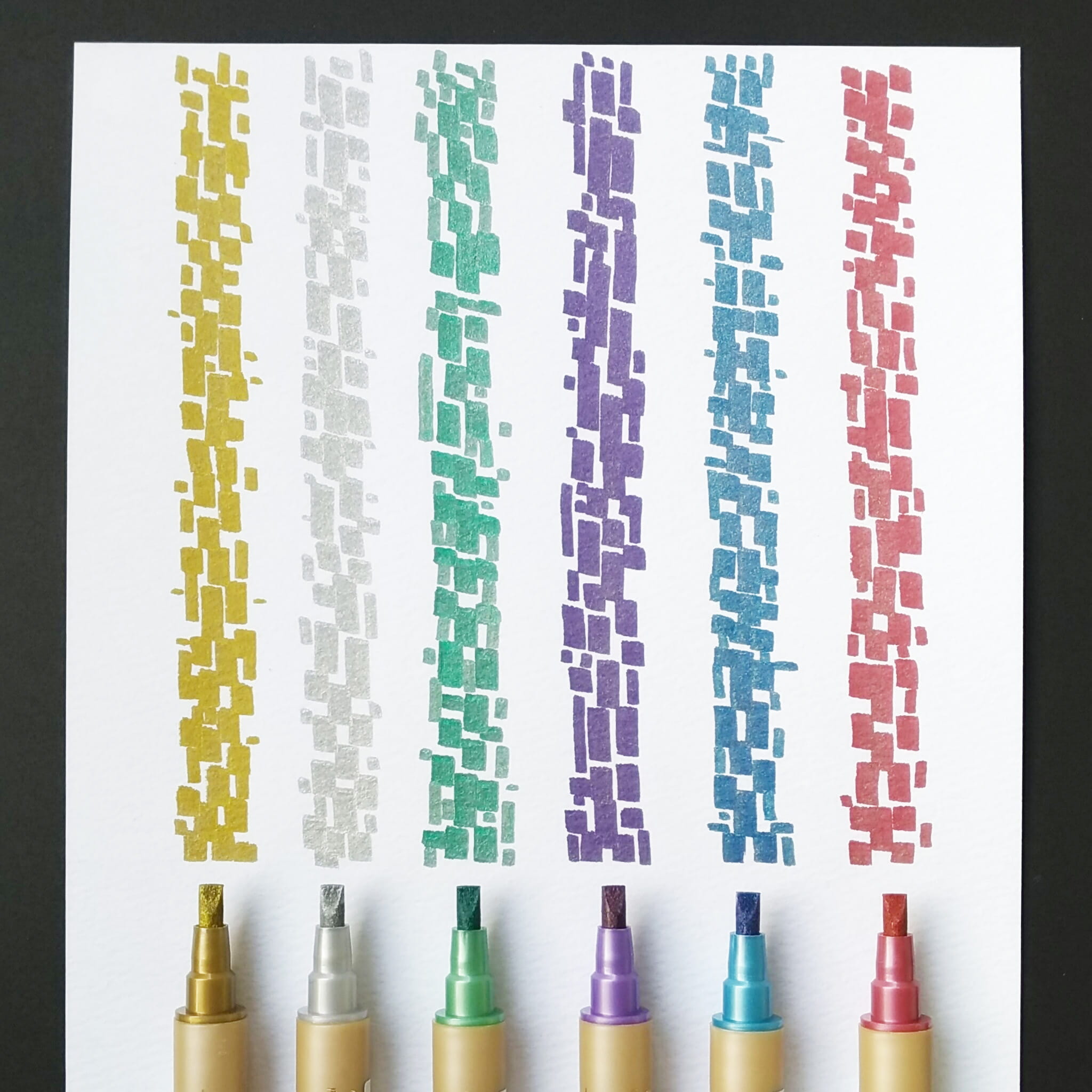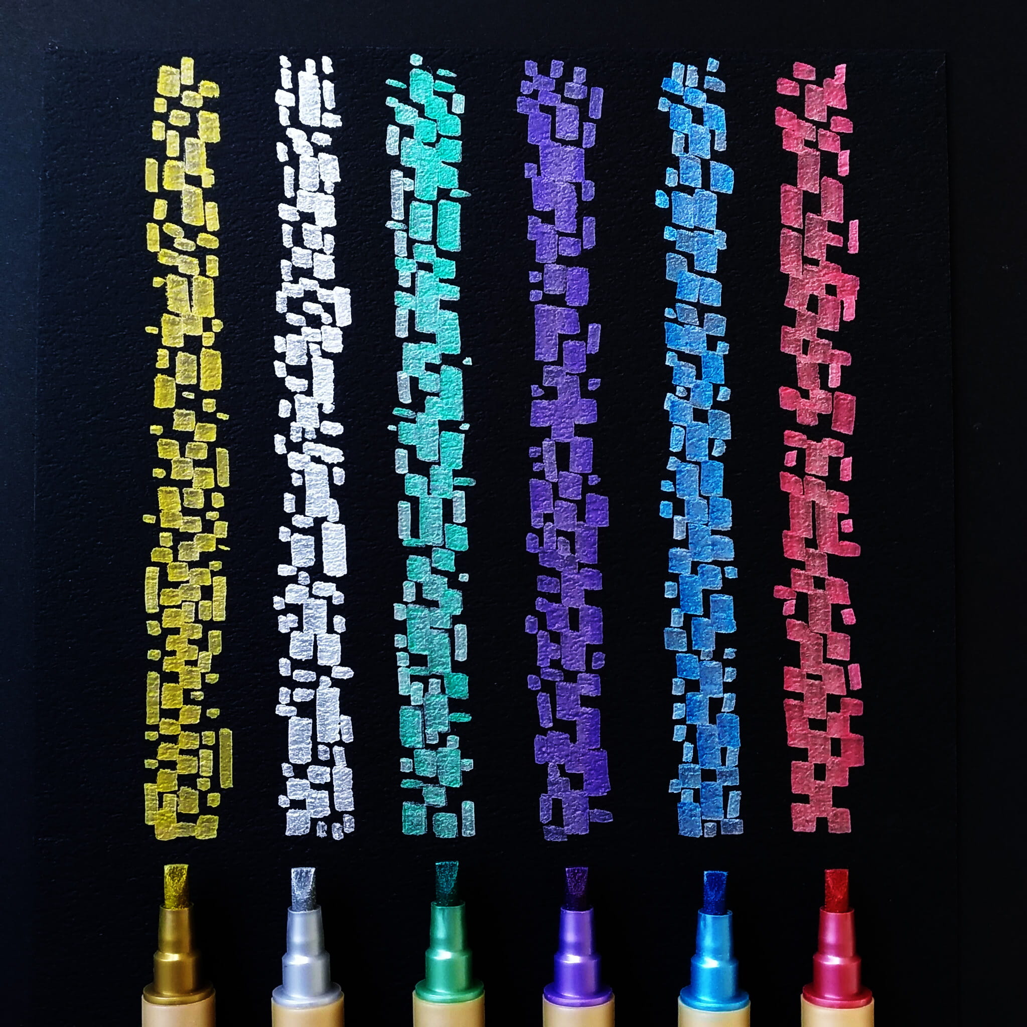 Markery metaliczne ZIG Memory System Calligraphy Metallic do kaligrafii sprawdzą się nie tylko do pisania ale i ozdabiana w projektach rękodzielniczych /scrapbookingowych. Szczególnie pięknie wyglądają na ciemnych powierzchniach! Każdy pisak z tej serii ma dwie końcówki ścięte na płasko, w szerokościach 2mm oraz 3,5mm.