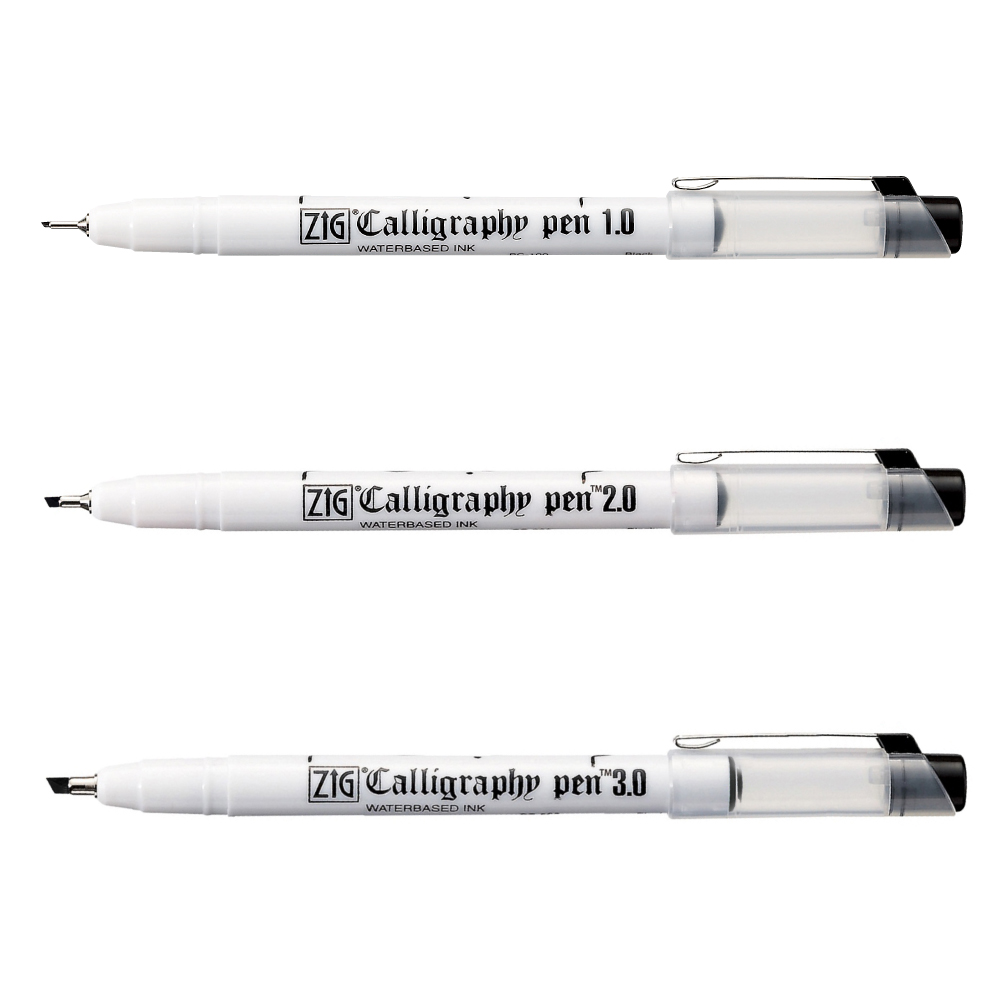 Pisaki z serii ZIG Calligraphy Pen dostępne są w dwóch rodzajach: z końcówką ściętą skośnie (OBLIQUE) i pod kątem prostym (SQUARE), oraz w trzech różnych grubościach: 1 mm, 2 mm oraz 3 mm. Zawierają wodny, bezwonny, barwnikowy tusz. Można je również używać jako narzędzia uzupełniającego do tworzenia ilustracji we współpracy z markerami z tuszem na bazie alkoholu - bez obawy rozmycia.