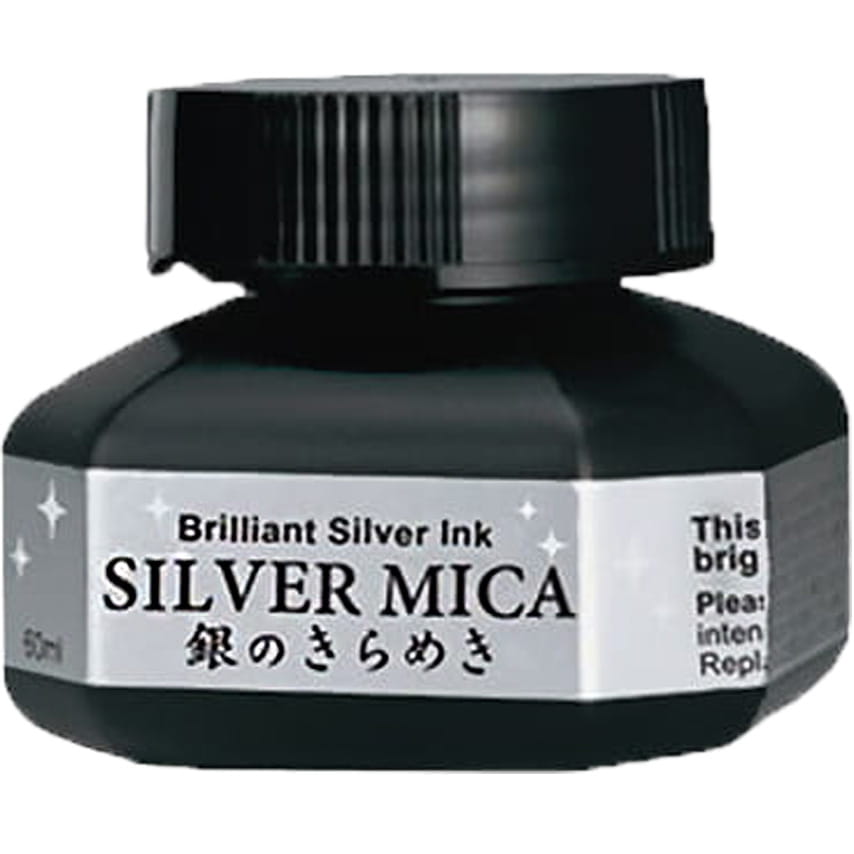 Kuretake Mica Silver to srebrny tusz do kaligrafii z drobinkami Mica. Idealny do kaligrafii, dobrze działa zarówno na jasnym jak i ciemnym papierze. Silnie kryjący wodny tusz, nadaje się również do malowania na tkaninach
