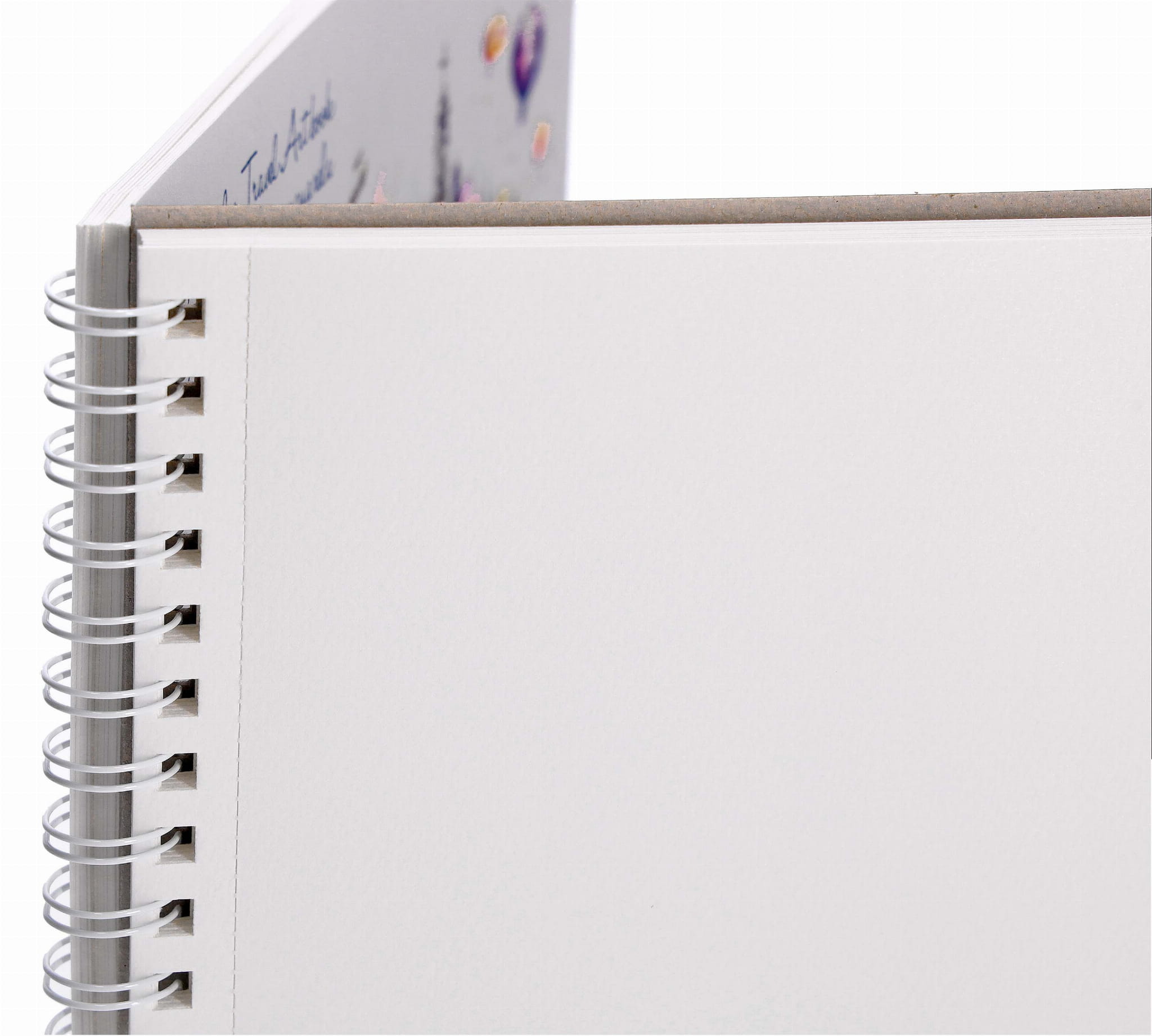 Blok akwarelowy o formacie 150X280mm idealny do zabrania w podróż. Solidny metalowy grzbiet umieszczony jest na krótszym boku bloku. Tył bloku jest usztywniany - dzięki temu możemy rysować "na kolanie". Travel Art Book posiada 25 arkuszy, a każda strona wewnątrz ma przy bindowaniu perforację pozwalającą na bezproblemowe wyrwanie kartki z bloku (nie potrzebujemy nożyczek do odcięcia dziurek od grzbietu). Grube arkusze 260gsm nadają się do wszystkich farb wodnych.
